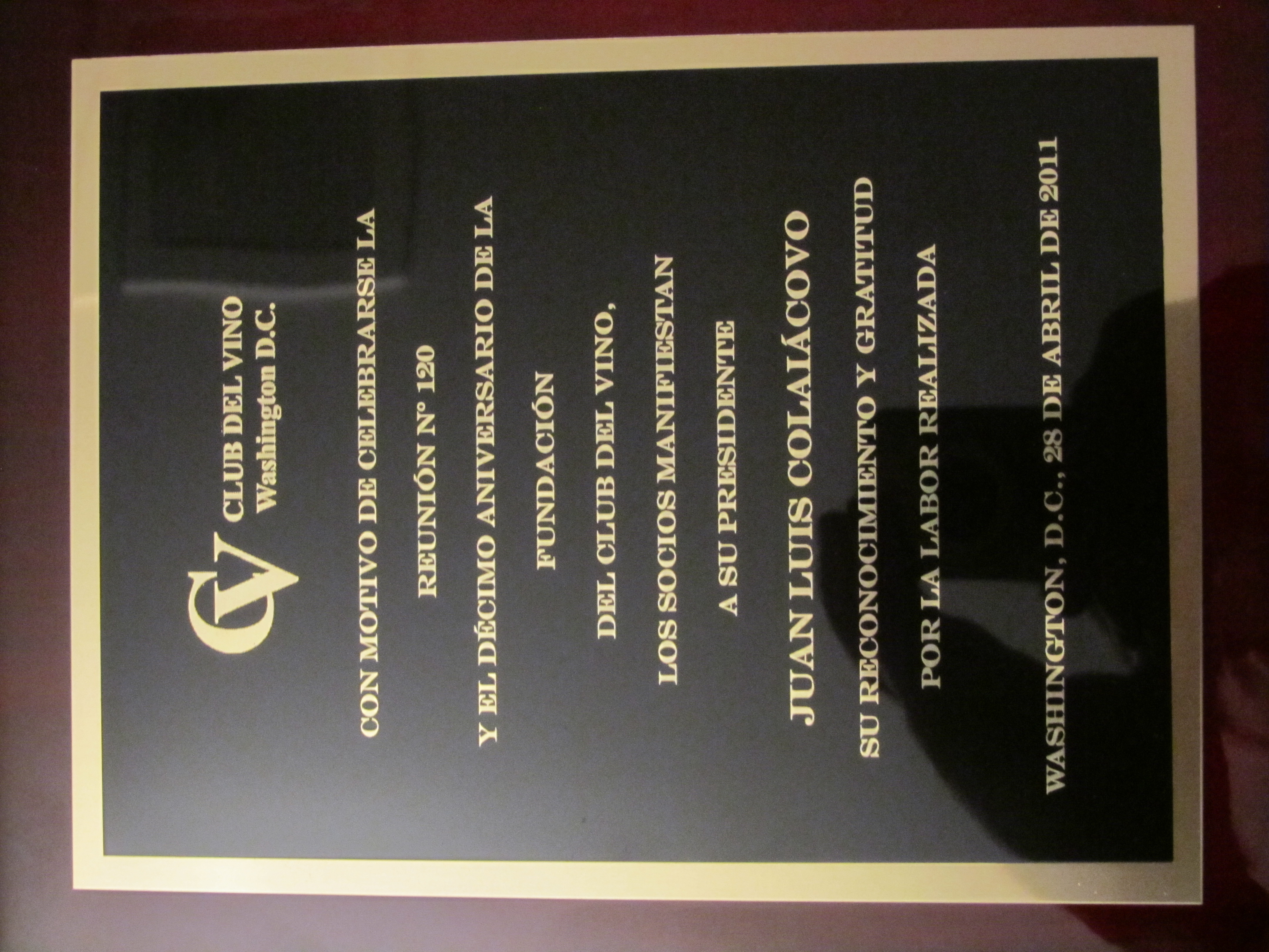 Plaque celebrating 10 years of the Club del Vino offered to Juan Luiz Colaiacovo