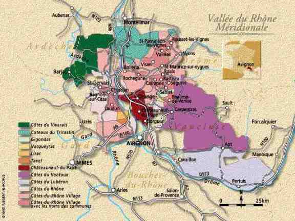 Las cooperativas hacen cerca del 70 por ciento del vino pero existen appelations como Chateau neuf du Pape, Côtes du Rhône and Côtes du Rhône Villages dentro de la cual 20 Villages pueden agregar su nombre al rotulo del vino (Giocondas, Vacqueiras, etc.). Las reglas aquí limitan el rendimiento del viñedo a no más de 42 hl/ha (normalmente 50 o más en otras regiones) y requieren un mínimo de 12.5 por ciento de alcohol. No se permite producción de rosé en la AC de Chateau neuf pero este se produce en las otras AC (en la AC Tavel solo se permite rosé) en cantidades importantes y de buena calidad. Los tintos del sur pueden durar hasta 25 años pero no mejoran con el tiempo después de unos 6 años y los blancos deben tomarse jóvenes (dos años como máximo).
