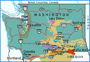 Las subregiones más importantes son Columbia Valley, Columbia Gorge, Yakima Valley, Rattlesnake Hills, Horse Heaven Hills, Walla Walla Valley y Puget Sound cercana a Seattle.