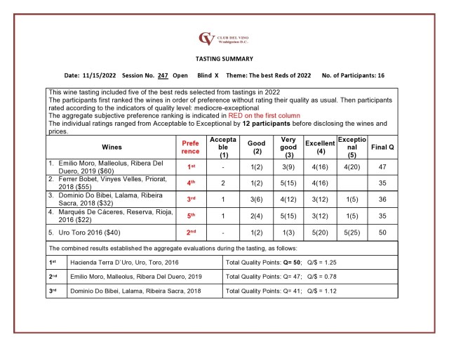 Tasting # 247 – November 15, 2022 – 12:30 The Best Red Wines of 2022: