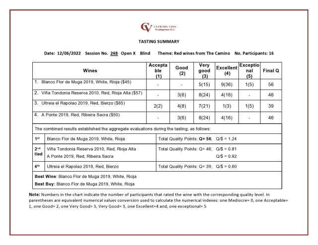 The tasting took place before the wines’ prices were revealed and 15 participants rated them from acceptable to exceptional. The combined results established the preference order during the tasting, as follows: