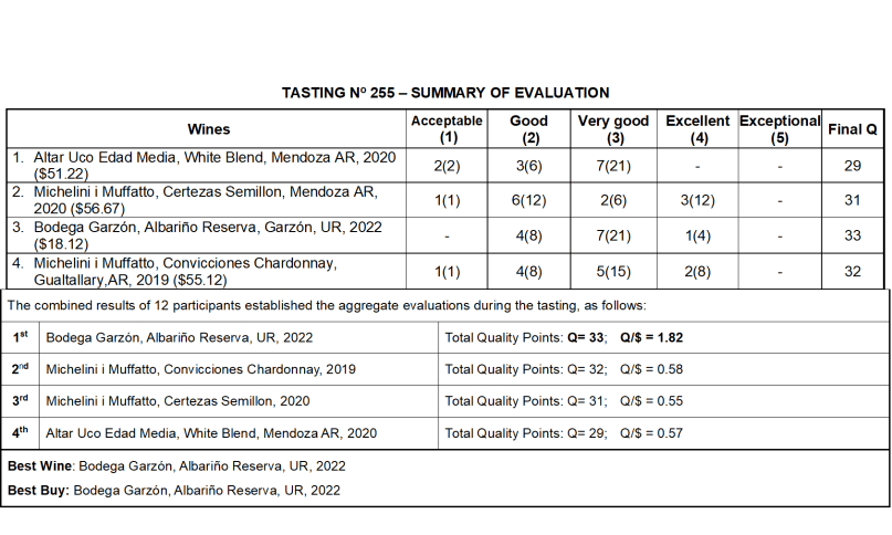 Bodega Garzón, Albariño Reserva, Uruguay, 2022 was rated as Best Wine and the Best Buy. The following Table presents the details of individual ratings and combined results.