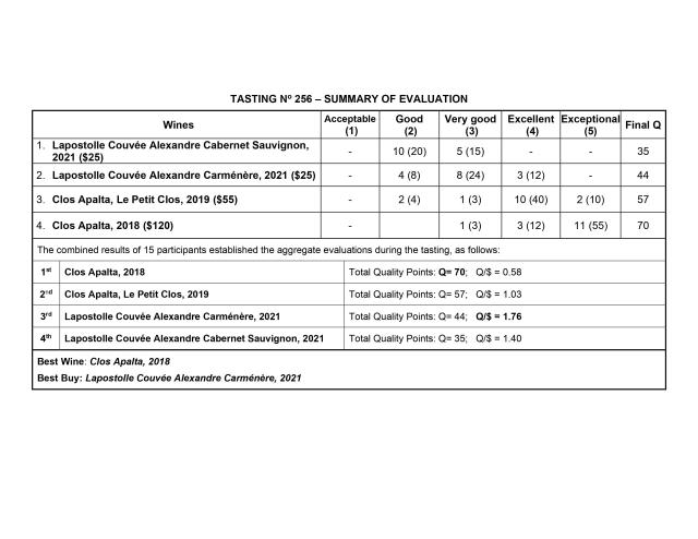 Clos Apalta, 2018 was rated as Best Wine and Lapostolle Couvée Alexandre Carménère, 2021 the Best Buy. The following Table presents the details of individual ratings and combined results.