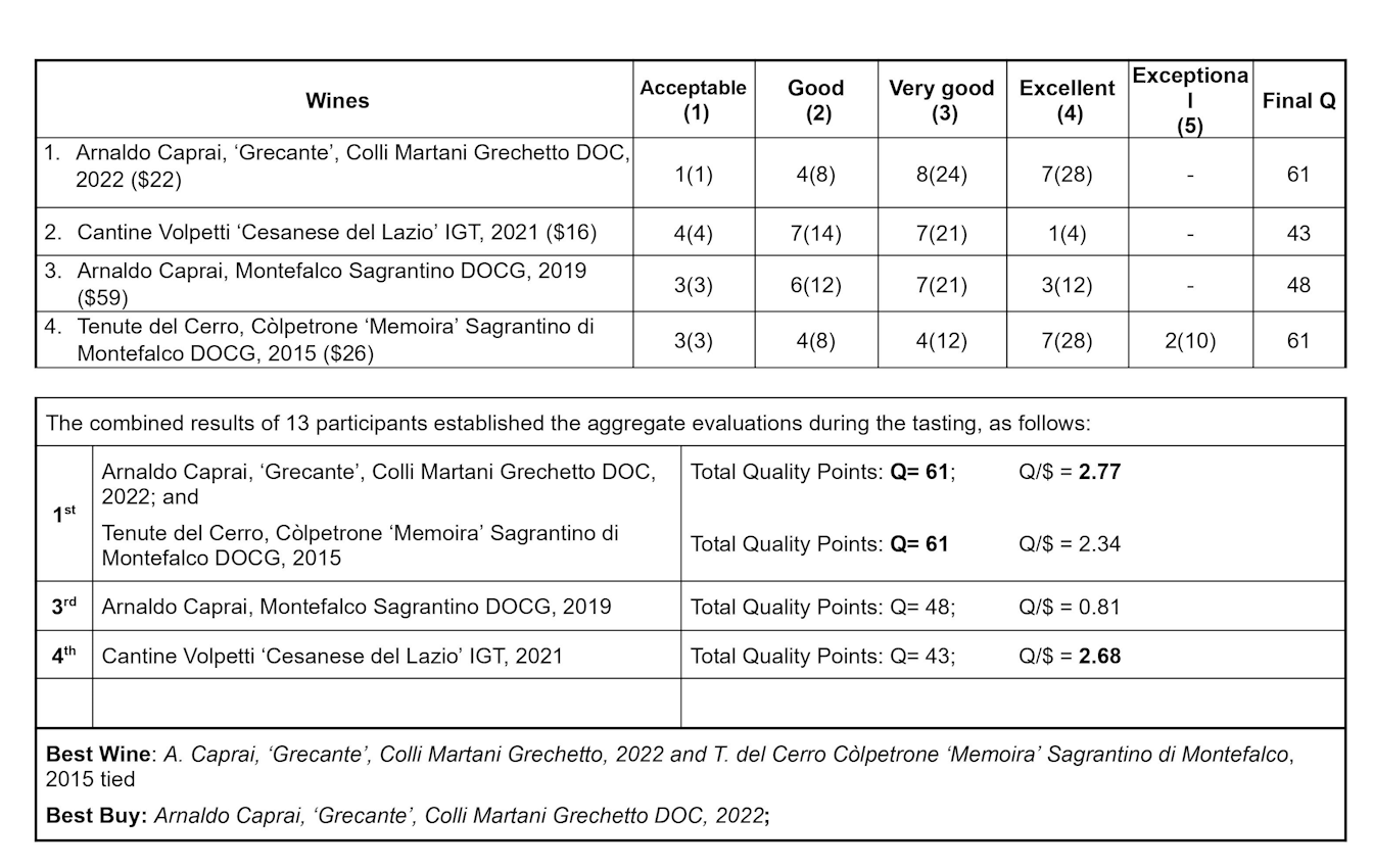 The white Arnaldo Caprai, ‘Grecante’, Colli Martani Grechetto DOC, 2022 and the red Tenute del Cerro, Còlpetrone ‘Memoira’ Sagrantino di Montefalco DOCG, 2015 tied Best Wine and the white ‘Grecante’, Colli Martani Grechetto DOC, 2022 was also the Best Buy.