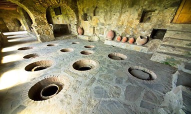 The ancient traditional Georgian winemaking method used Kvevri clay jars. These are very large egg-shaped earthenware vessels with an inside coat of beeswax. When filled with the fermented juice of the harvest, the kvevris are topped with a wooden lid and then covered and sealed and buried underground . Today wine is made using either kvevris or modern stainless steel, oak barrels or concrete tanks as used in Europe.