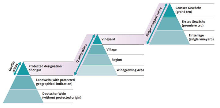 Qualitätswein is now subdivided into four narrowing tiers of origin. These are: Anbaugebiet (wine region), Region or Bereich (district), Ort (village), and Lage (vineyard). Lage sits at the apex of this pyramid.